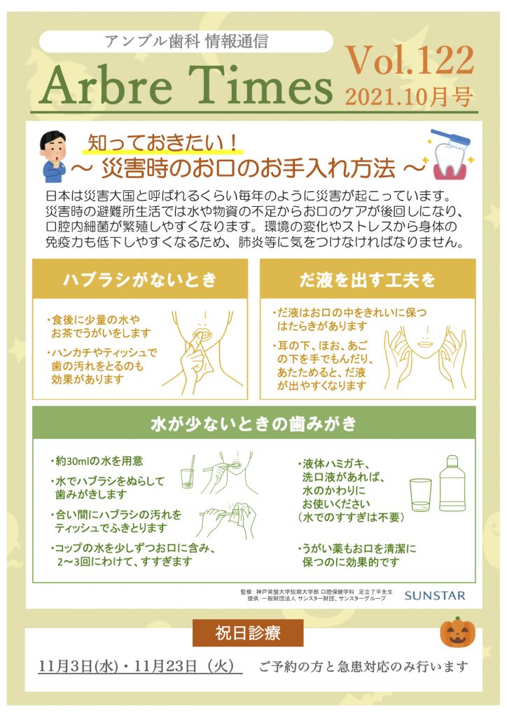 アンブル歯科情報通信 Arbre TIMES 10月号 2021.10.18 こんにちは♪ 運動会シーズンですね近所の小学校では子供達の元気な声が響いており 子供達の一生懸命な姿を見ると、こちらも元気が湧いてきます それでは、アンブルタイムズ10月号です。 是非ご覧下さい。 ▼アンブル歯科通信 R3.10月号